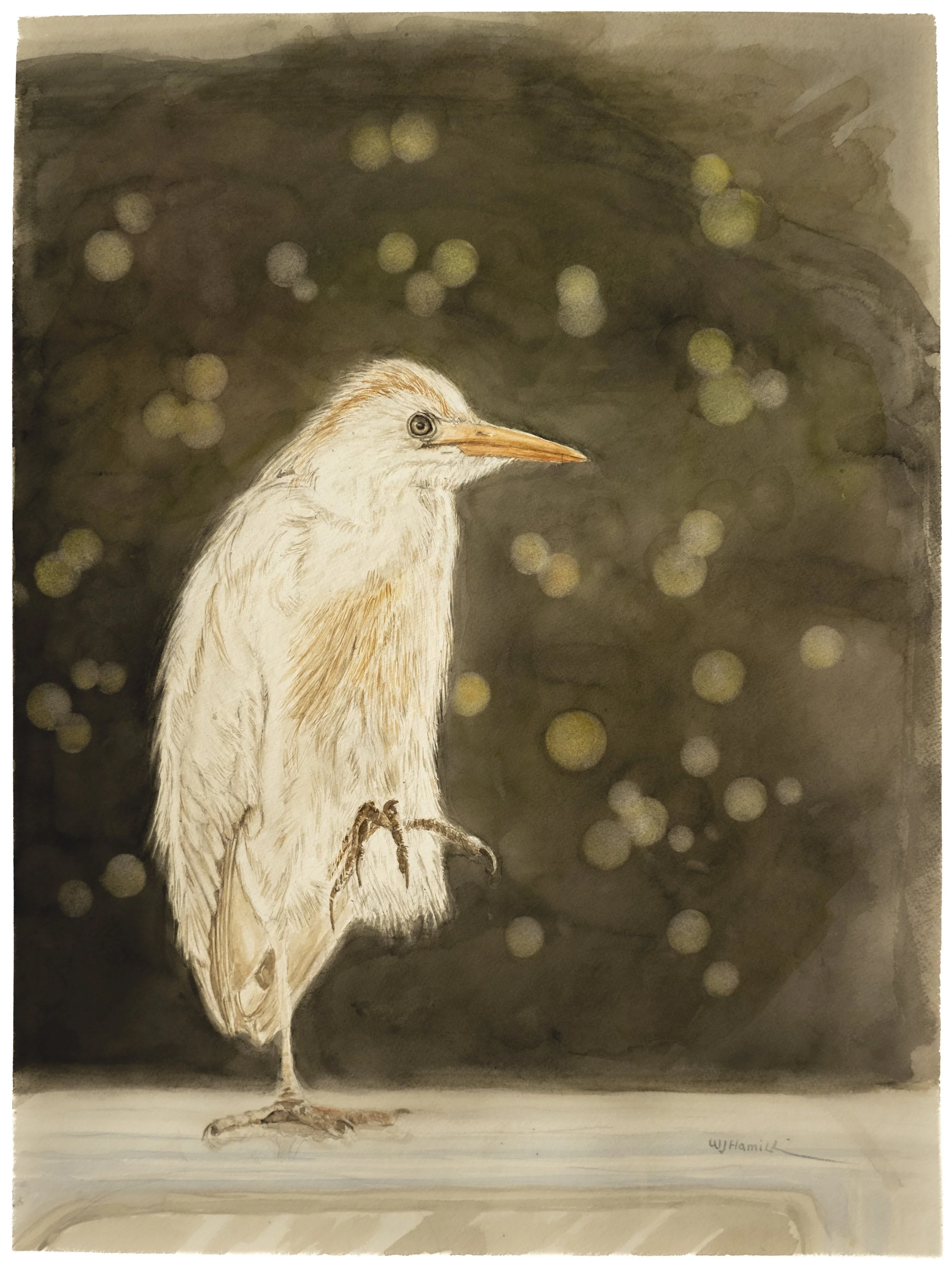 Cattle Egret top of a car 18" x 24" Water color on paper ----Giclee on water color paper 9"x12" $200
